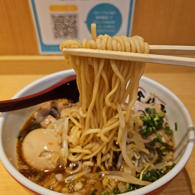 空港価格というところもありますが、¥1,200の価値はある豪華なラーメンですね。具材は味玉、角切りチャーシュー、大盤のチャーシュー、玉ねぎ、ネギ、そしてもやしと味噌ラーメンの定番具材が揃っています。