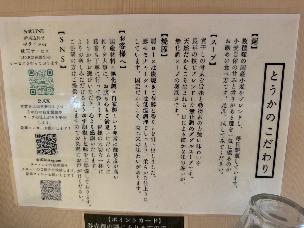 席についてから、まず目に入ったのが店内の案内。「とうかのこだわり」として、麺・スープ・焼豚が丁寧に説明されていました。