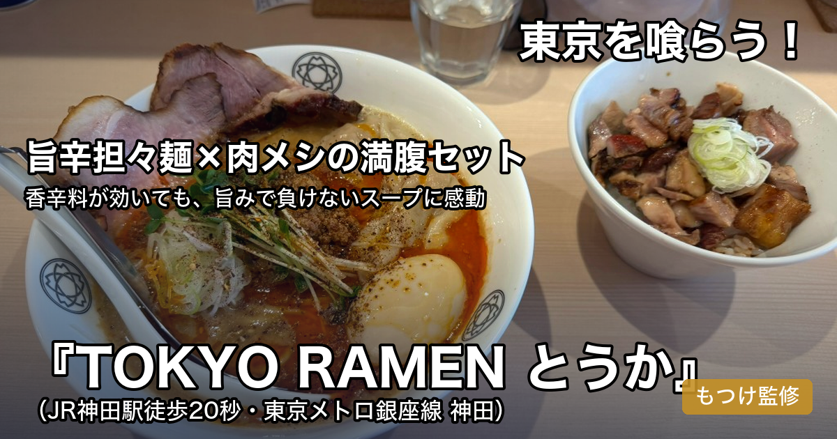 今回は、神田駅至近にオープンした「TOKYO RAMEN とうか」で、特製担々麺と肉メシセットを実食したレポートでした。八王子の名店「もつけ」監修という看板に偽りなく、無化調のダブルスープと自家製麺、そして肉の旨味がちゃんとするチャーシューが、一杯の完成度を押し上げています。